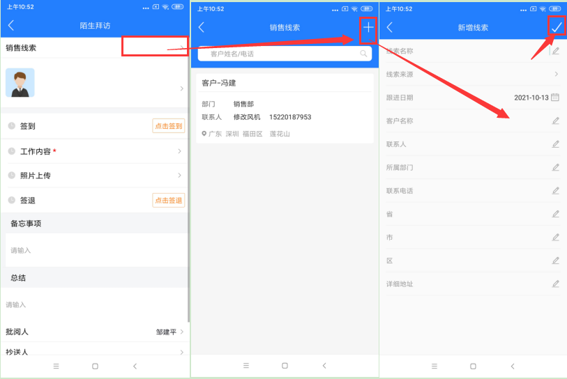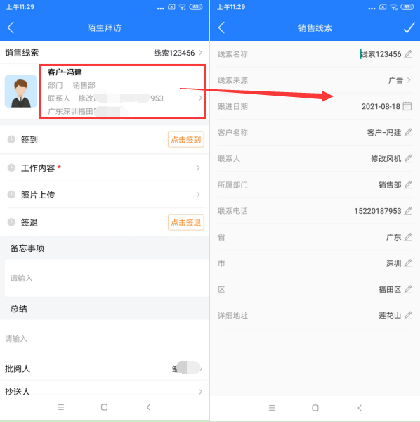 选择销售线索后在陌生拜访界面显示销售线索记录,点击可以对销售线索进行修改操作。