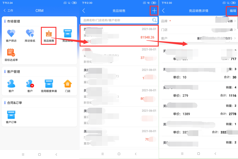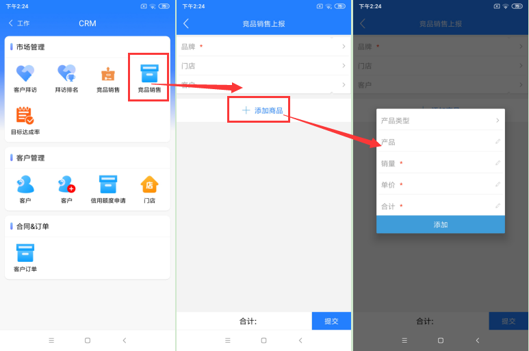 在【工作台—CRM—市场管理—竞品销售】 ,然后点击页面竞品销售图标,进入到竞品销售创建页面。如图首先选择品牌、门店、客户,其次点击添加产品,针对产品的信息进行维护如产品类型、销量、单价等,最后确认无误点击提交即可完成竞品销售的创建。