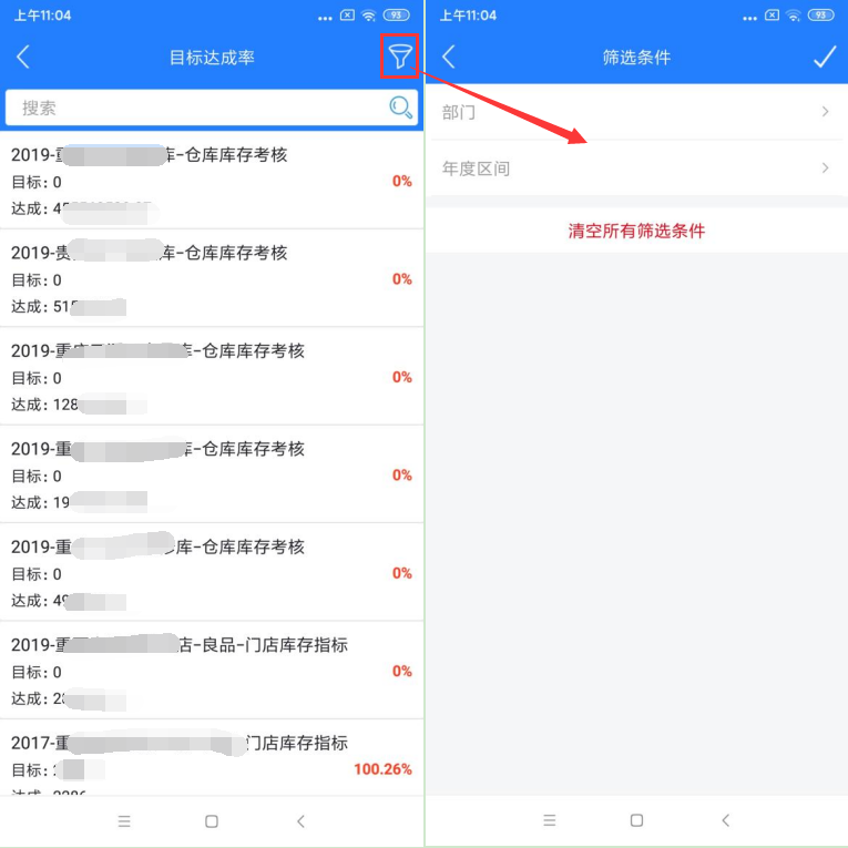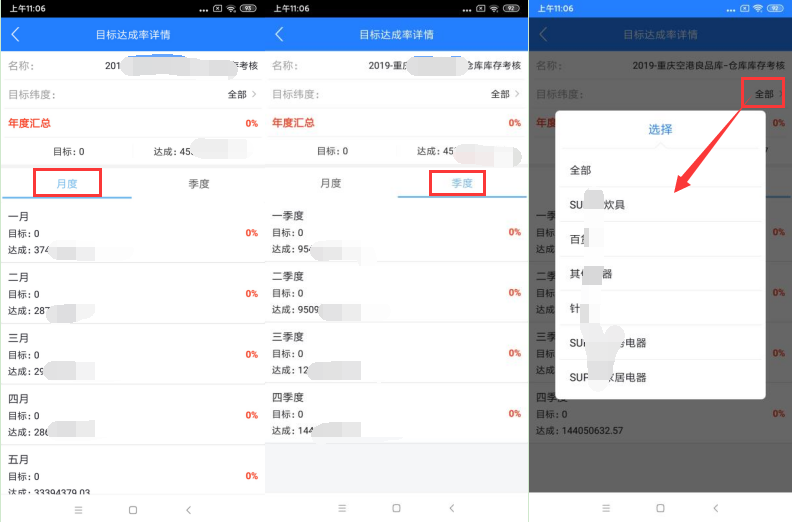 点击目标达成率图标,进入到目标达成率查看页面。点击右上方的筛选按钮 可以根据部门以及年度区间来进行筛选,同时搜索框可以进行关键字的检索,输入关键字可以讲所有包含此关键字的信息都筛选出来。 点击列表中对应的数据条项可以查看该条数据的具体信息,如图可以根据月度或者季度查看该名称的目标达成率,可以选择目标维度查询目标单一维度目标达成率详情。