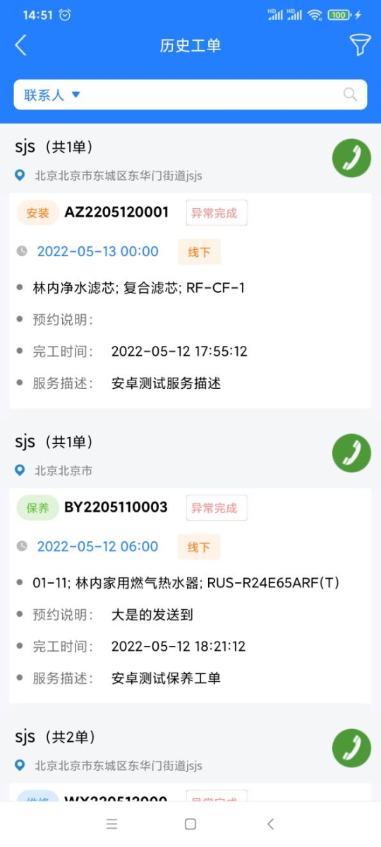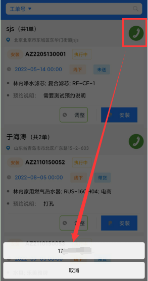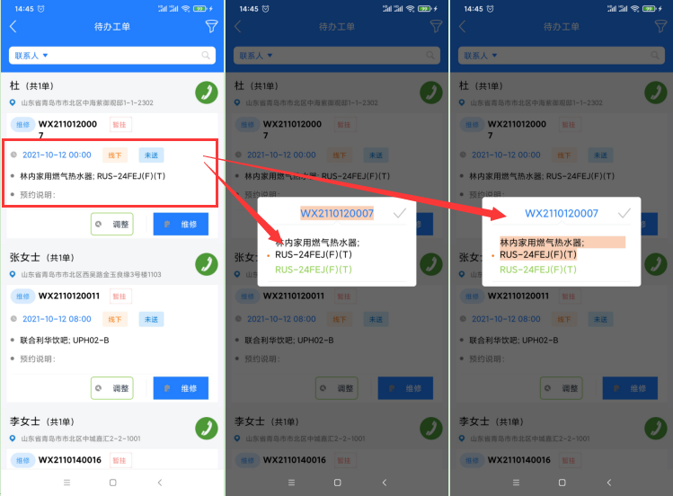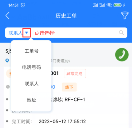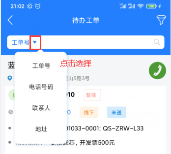 点击搜索框里的小三角,可以选择工单号、电话号码、联系人和地址等信息进行搜索,搜索时需要选择对应的条件进行搜索查询。例如,想根据工单号查询,就选"工单号",然后输入工单号,点击查询。
