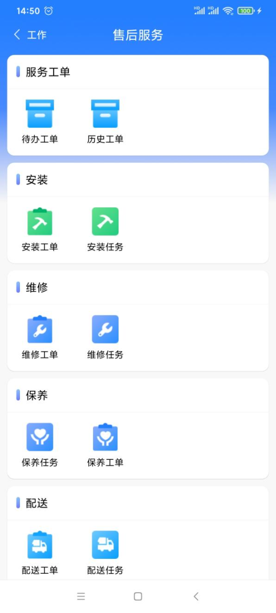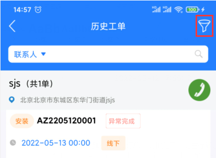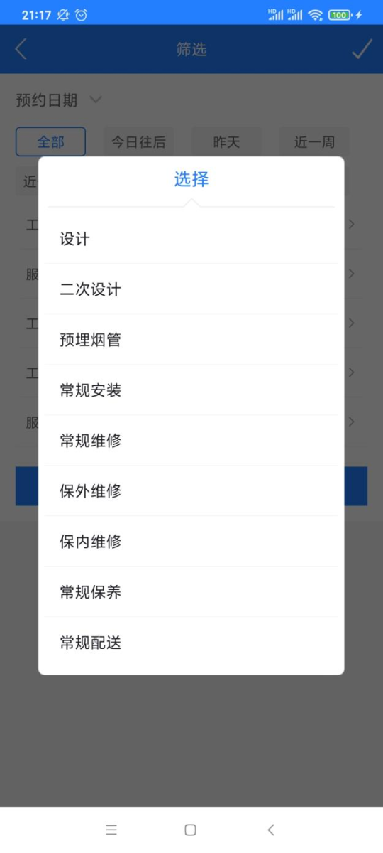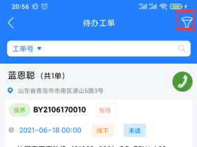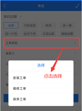 2.可以根据"工单类型"进行筛选,选择安装工单、维修工用的和保养工单进行筛选;