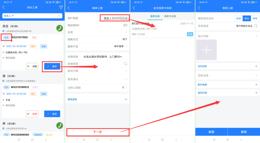 - 用户信息:点击姓名/电话,可以查看该用户的会员保修卡信息(服务记录和保修卡记录)。
