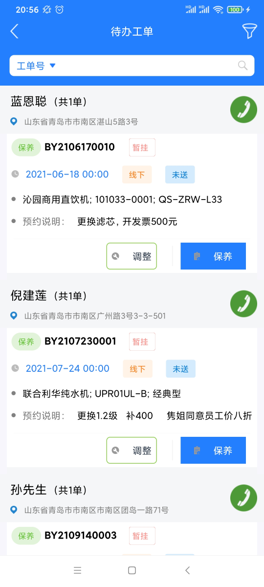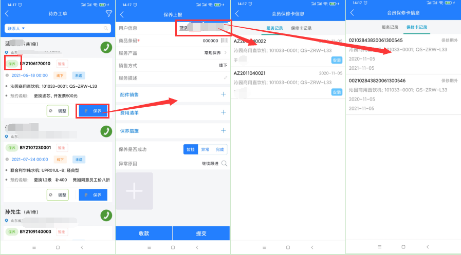 前面有"保养"字样的工单,点击保养按钮,进入到保养上报界面,填写相应的内容等必填信息,如果有配件,可以点击配件销售+,添加配件信息。选择保养是否成功,然后点击提交按钮,保养工单完成。