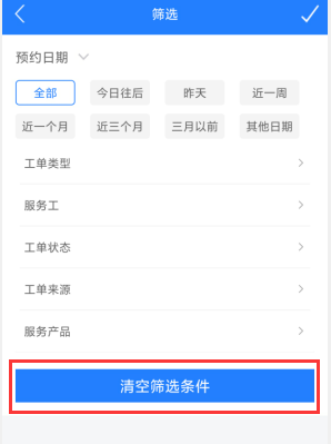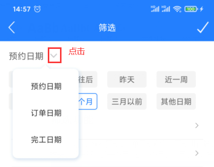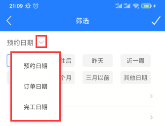 1.可以根据预约日期、订单日期和完工日期进行筛选;时间期间可以选择全部、今日往后、昨天、近一周、近一个月、进三个月、三月以前、其他日期(自定义日期)。
