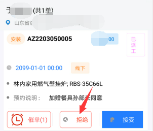 对于其他情况不能安装的工单,可以点击<拒绝>按钮,填写拒绝原因,点击确定。