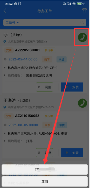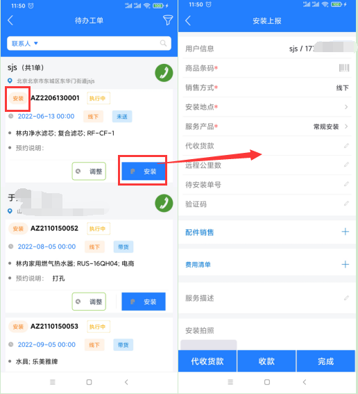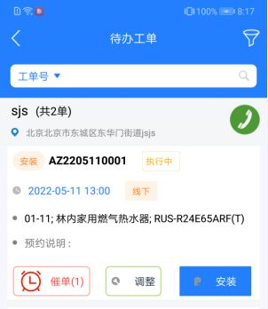 前面有"安装"字样的工单,点击安装按钮,进入到安装上报界面,填写相应的内容,如果有配件,可以点击配件销售+,添加配件信息。选择是否成功,然后点击右下角的完成按钮,安装工单完成。