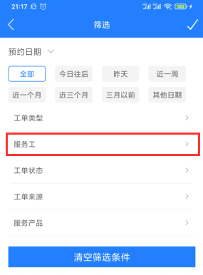 3.可以根据"服务工"进行筛选,这个服务工需要开通相应的权限才能看到其他服务工信息;