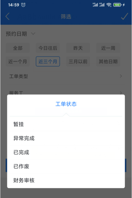 4.可以根据工单状态进行筛选,状态分为:暂挂、异常完成、已完成、已作废和财务审核等。