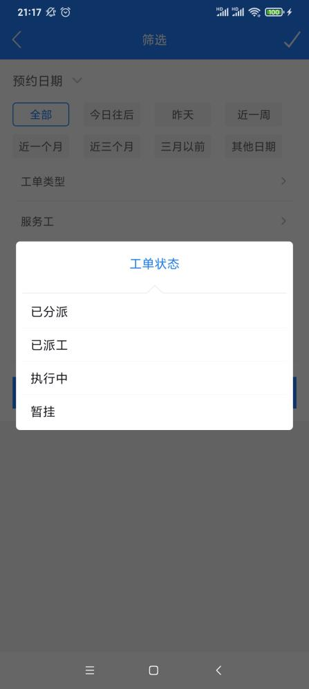 4.可以根据工单状态进行筛选,状态分为:已分派、已派工、执行中和暂挂等;