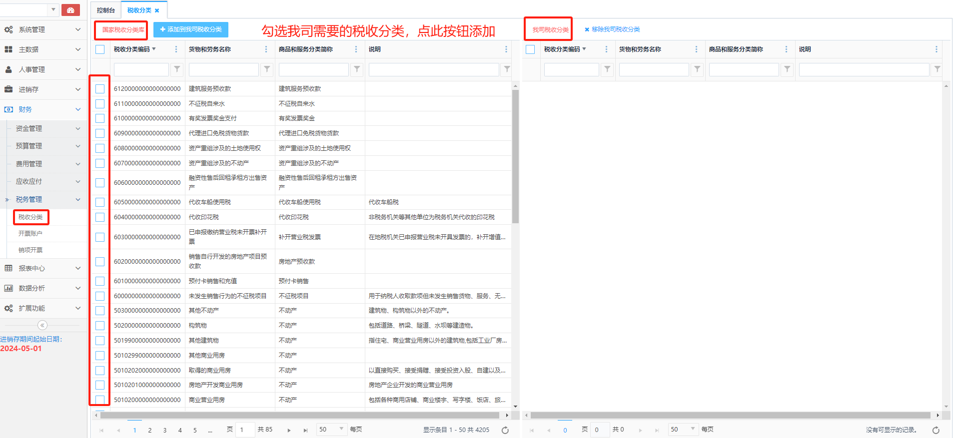 操作:从国家税收分类库勾选后同步收税分类代码到本公司,左边是国家税收分类库,右边是本公司需要使用的税收分类