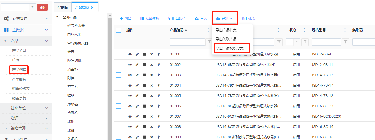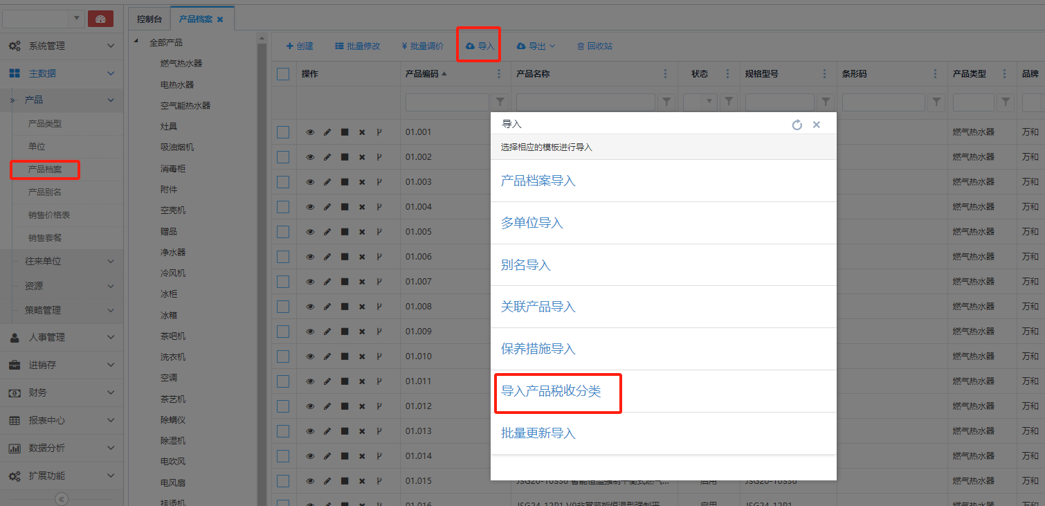 操作:产品档案导入功能中选择导入产品税收分类,下载模版后根据模版内容填写表格后上传到系统。也可以导出已关联税收分类的产品