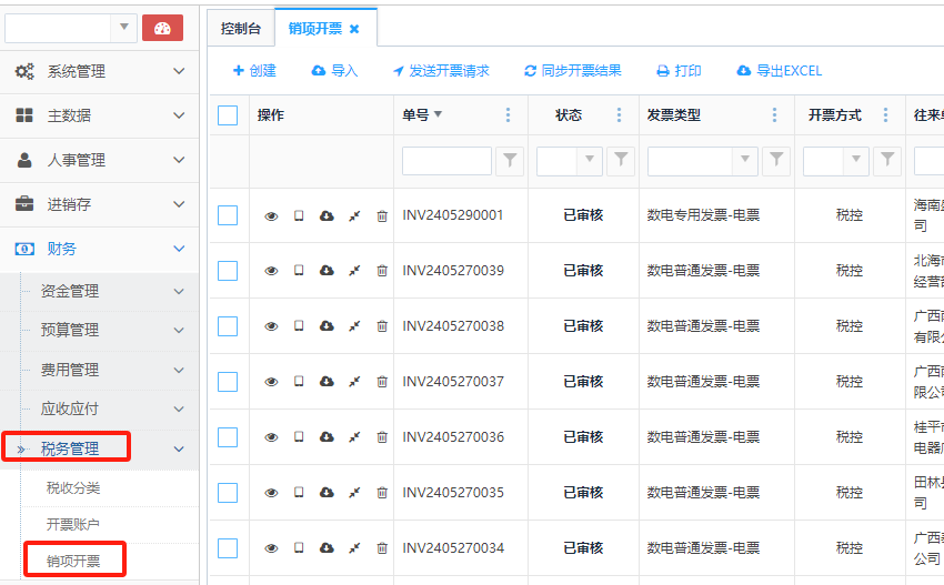- 发送开票请求后系统会自动同步开票结果(每5分钟同步一次开票结果)