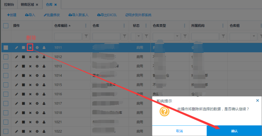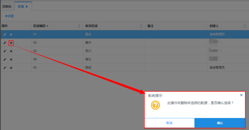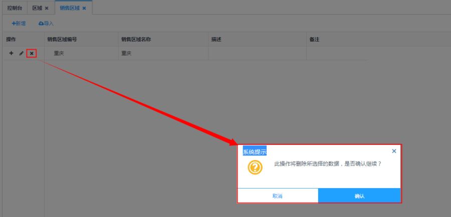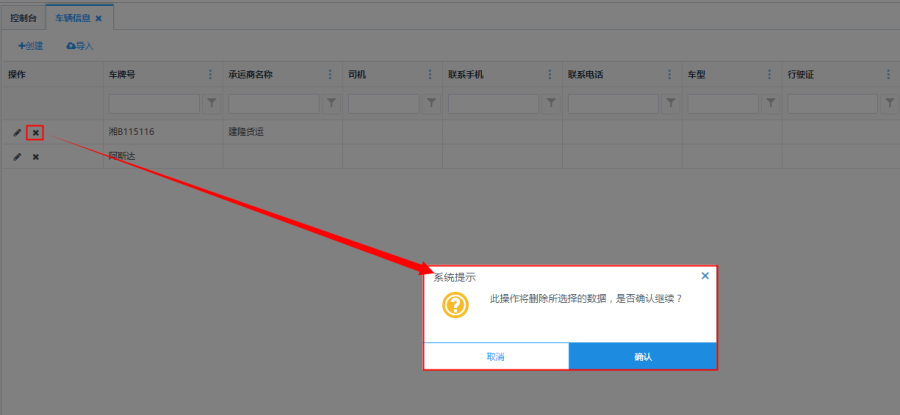 点击<删除>按钮,弹出提示,点击提示上的<确认>按钮,删除该条记录;点击提示上的<取消>按钮,则返回不删除。