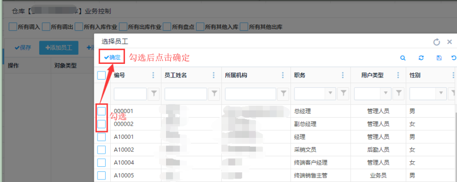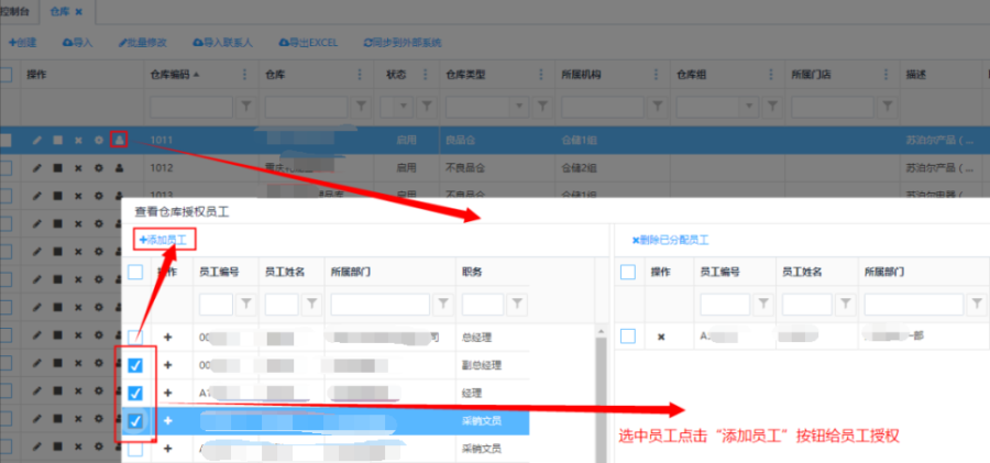 第一步:点击角色列表操作栏的<授权员工>按钮,将出现"仓库授权员工"的弹框。