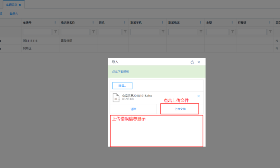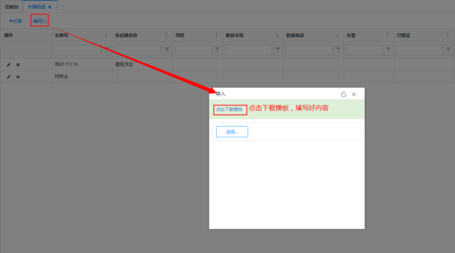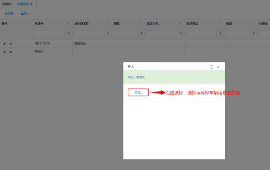 点击<导入>按钮可批量导入数据,创建车辆信息单。导入操作如图: