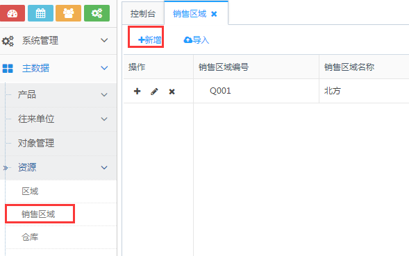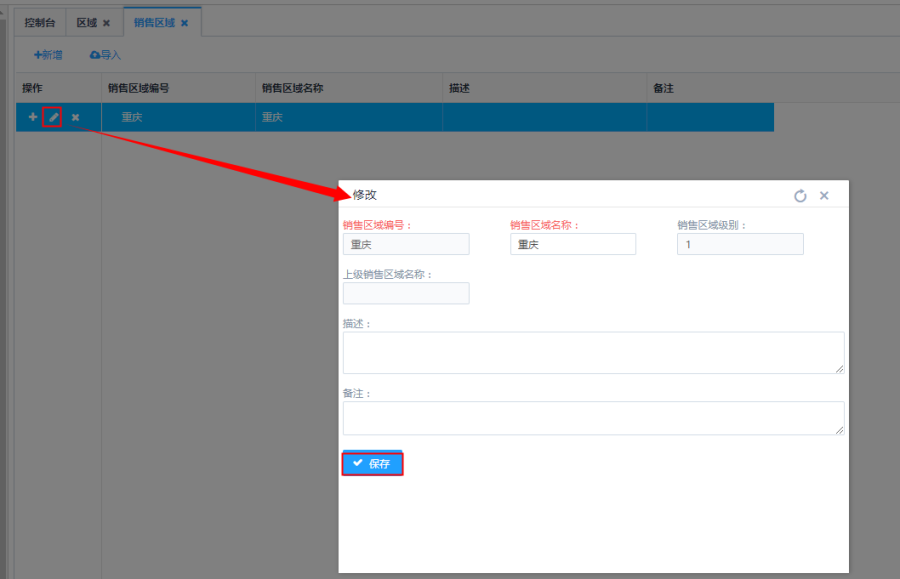 点击操作栏的<添加下级>按钮,可以为相应的销售区域添加下级销售区域。