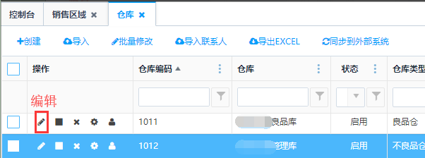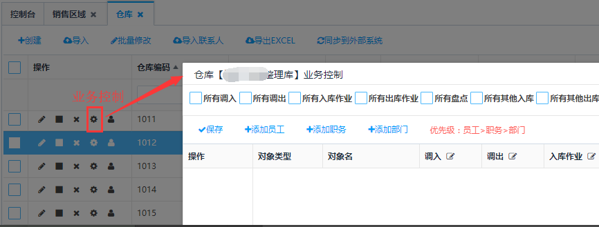 第一步:点击操作栏列表的<业务控制>按钮,将出现"仓库【仓库名称】业务控制"的弹框界面。