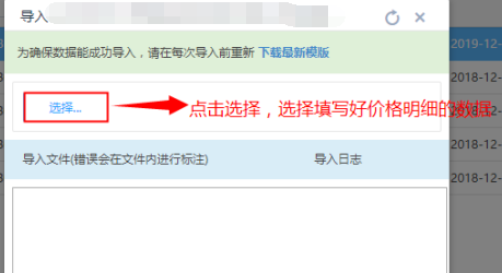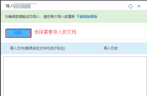 第二步:下载模板后,填写相应的数据,点击<选择>,选择保存的文件: