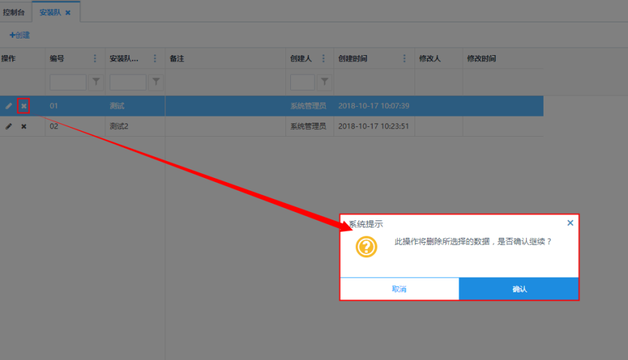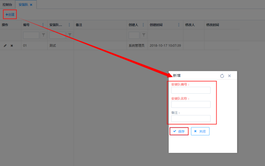 填写好安装队编号、安装队名称、备注相关信息后保存即可。