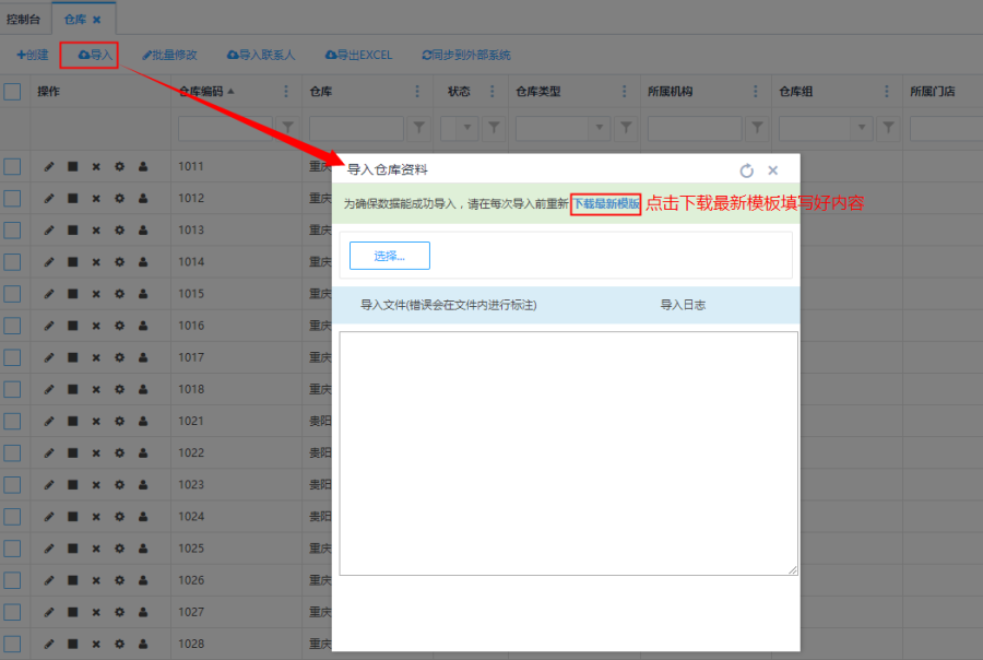 第一步:点击列表上方的<导入>按钮,在仓库资料导入页面点击<下载最新模板>填写好内容: