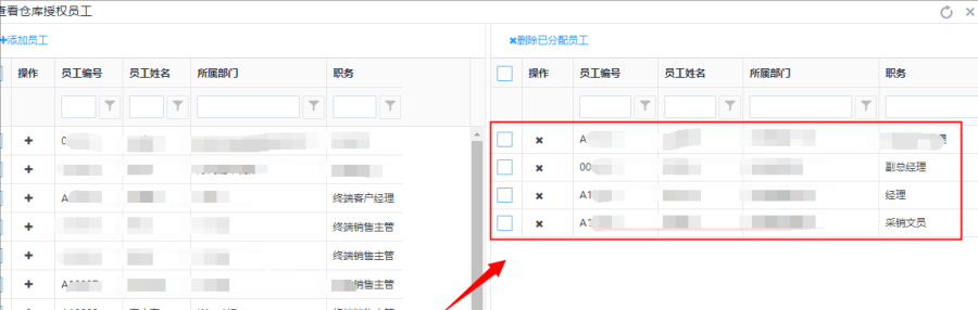 第二步:被添加角色的员工将显示在弹框的右边列表中,并拥有该仓库的所有权限。