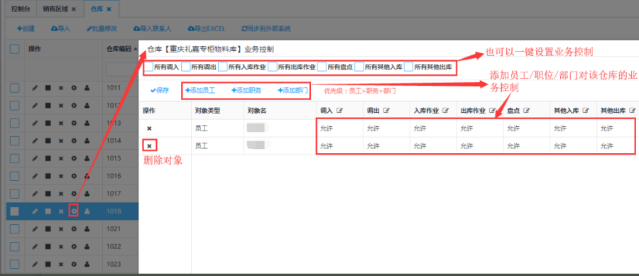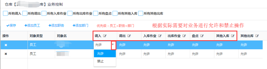 - 业务类型控制选项:允许和禁止,选择"允许"时,添加的员工/职务/部门可以对该仓库的业务类型进行操作;选择"禁止"时,添加的员工/职务/部门对该仓库的业务类型没有权限,不能操作。(如图操作)