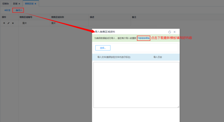 第一步:点击列表上方的<导入>按钮,在导入页面点击<下载最新模板>填写好内容: