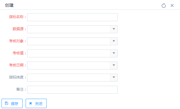 第二步:填写指标名称、选择数据源、考核对象、考核值、考核日期、指标纬度和填写备注,然后点击<保存>按钮。若暂时不需要,点击<关闭>按钮;如图: