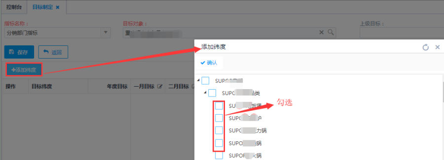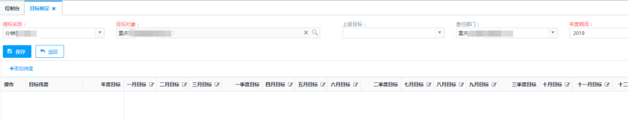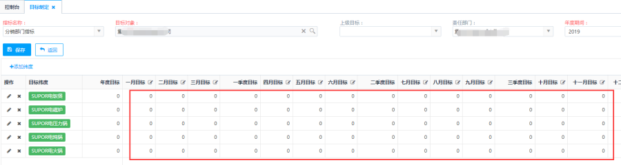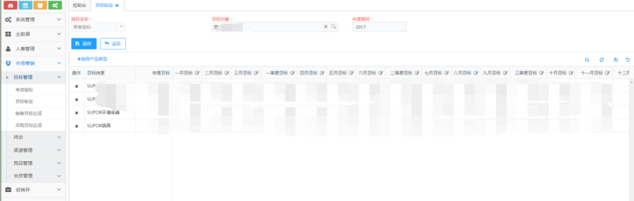 第二步:选择指标名称,选择目标对象,填写年度时间,选择产品类型,依次填入每月的目标数,目标为数字;如图: