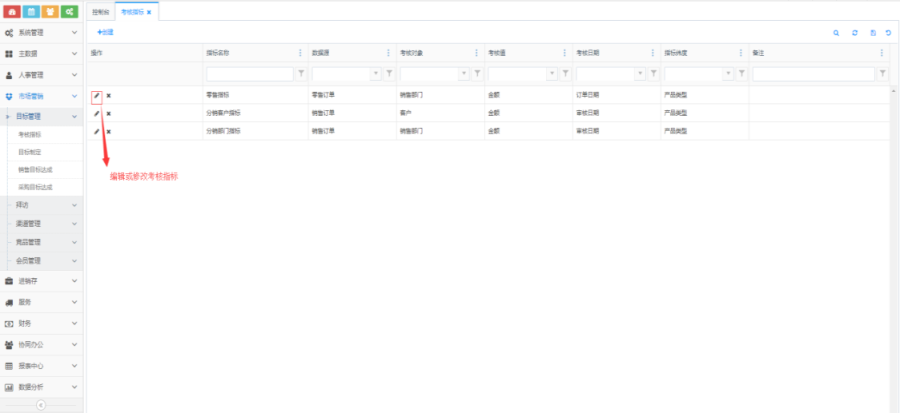 第一步:修改考核指标,选择需要修改的考核指标,在相应的操作内选择图标< >按钮,进入到考核指标修改页面。如图
