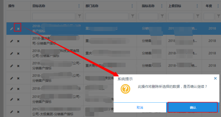 选择需要删除的目标制定,点击操作的<删除>按钮,进入到目标制定删除页面,若删除,点击<确认>按钮;若取消删除,点击<取消>按钮