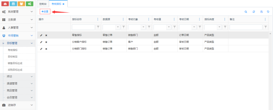 第一步:创建考核指标,点击页面左上方的<创建>按钮,进入到考核指标创建页面。如图