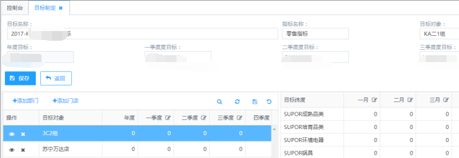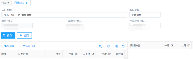 第三步:完成第二步之后,选择要分解目标的部门或门店,点击图标< 查看>按钮,之后在右边进行输入每月的目标值,输入完成之后就点击保存即可,如图: