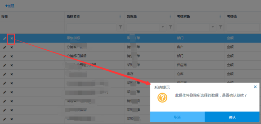 选择需要删除的考核指标,点击操作内的<删除>按钮,进入到考核指标删除页面,如图:若删除,点击<确认>按钮;若取消删除,点击<取消>按钮