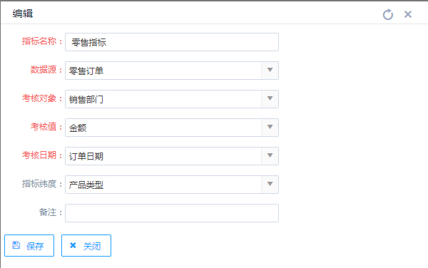 第二步:编辑指标名称、选择数据源、考核对象、考核值、考核日期、指标纬度和填写备注,然后点击<保存>按钮。若暂时不需要,点击<关闭>按钮;如图:
