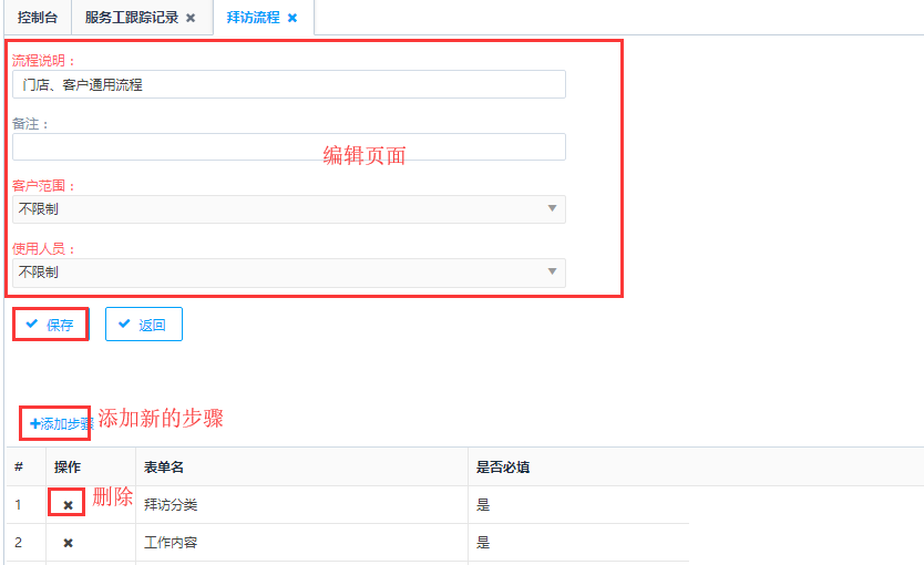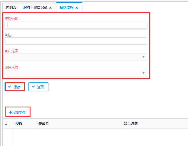 第二步:填写流程说明和备注,选择客户范围和使用人员,添加步骤后点击<保存>按钮,完成拜访流程的创建。如图: