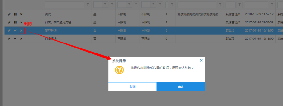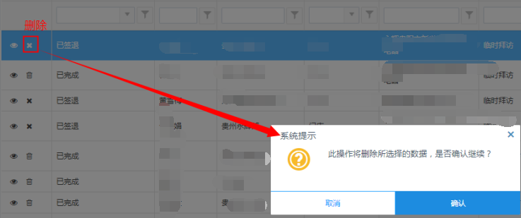 点击<删除>按钮,弹出提示,点击提示上的<确认>按钮,删除该条记录;点击提示上的<取消>按钮,则返回不删除。
