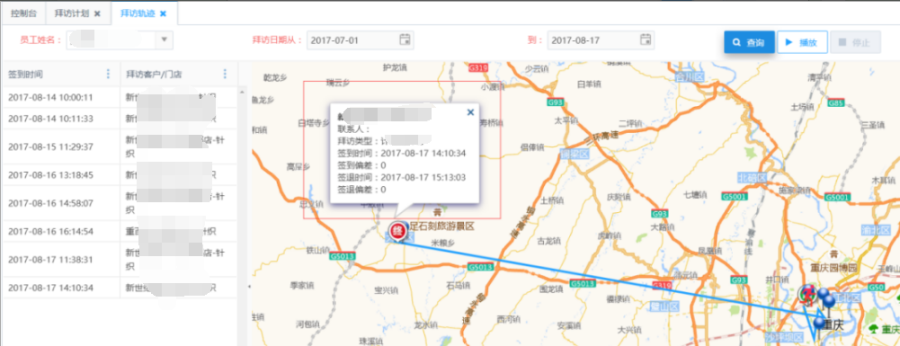 点击查询之后,点击地图中的标点,就可以查询标点拜访详细资料,如图