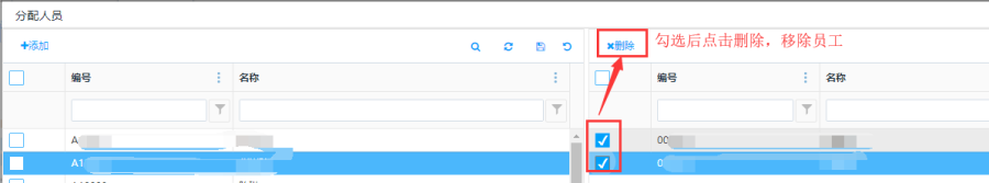 在右边勾选需要删除的员工,点击<删除>按钮,可将员工移除。
