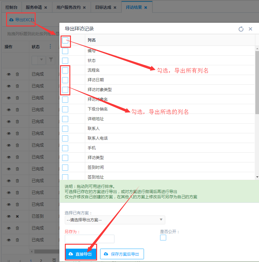 点击列表上方的<导出EXCEL>按钮可导出拜访结果列表所有内容。