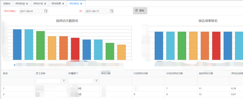 选择日期,可查询一段区间的拜访排名,拜访排名可以查看"按拜访次数"、"按达成率"以及员工拜访排名,如图