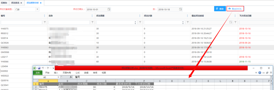 点击列表上方的<导出EXCEL>按钮可导出拜访频率分析列表所有内容。