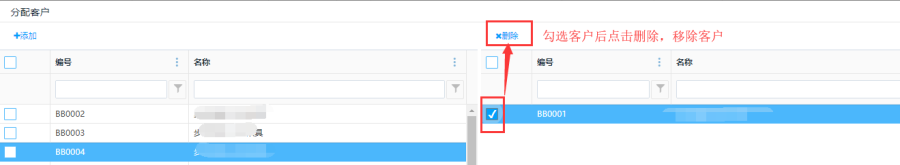 在右边勾选需要删除的客户,点击<删除>按钮,可将客户移除。