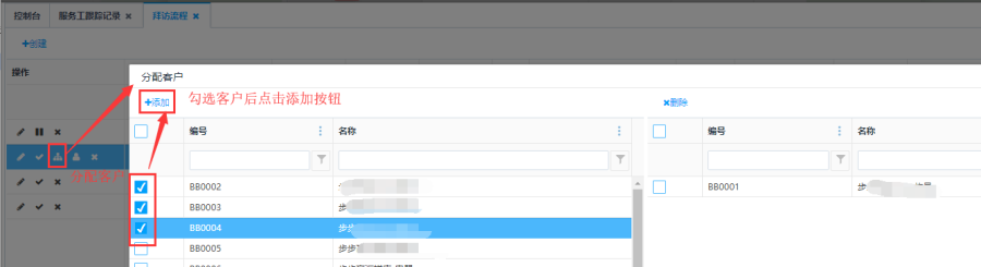 选择需要分配客户的拜访流程,点击<分配客户>按钮,跳转到分配客户界面,选择需要添加的客户勾选,然后点击左上方的<添加>按钮,进行添加;添加成功后会在右边框显示。如图