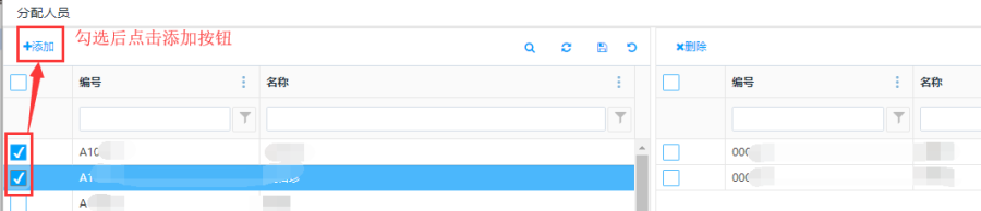 选择需要分配人员的拜访流程,点击<分配人员>按钮,跳转到分配人员界面,选择需要添加的员工勾选,然后点击左上方的<添加>按钮,进行添加;添加成功后会在右边框显示。如图