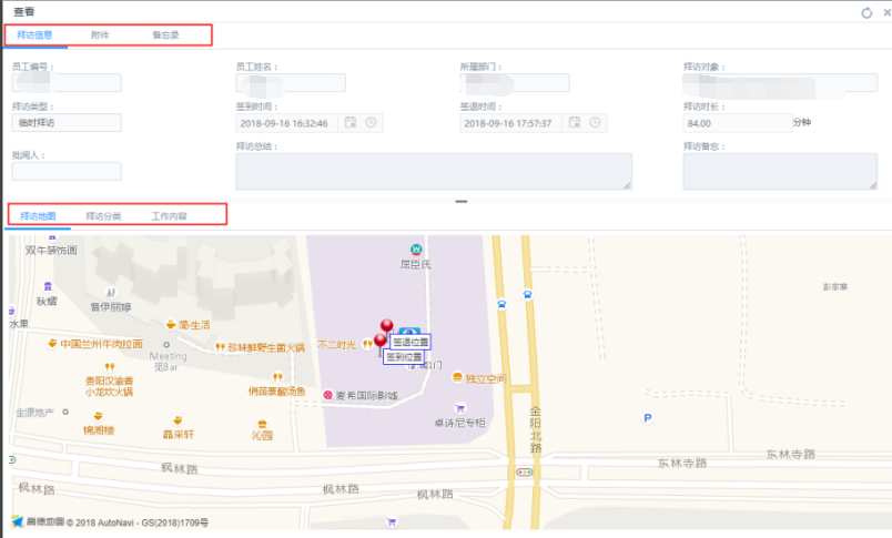 点击<查看>按钮进行查询详细拜访结果,如图;进入详细页面,就可以查看拜访信息、附件、备忘录,也可以查看拜访地图、拜访分类及工作内容,如图: