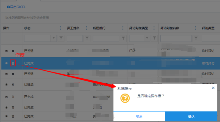 已签到、已签退状态的订单,可以对订单进行删除操作。点击<删除>按钮,弹出提示,点击提示上的<确认>按钮,删除该条记录;点击提示上的<取消>按钮,则返回不删除。