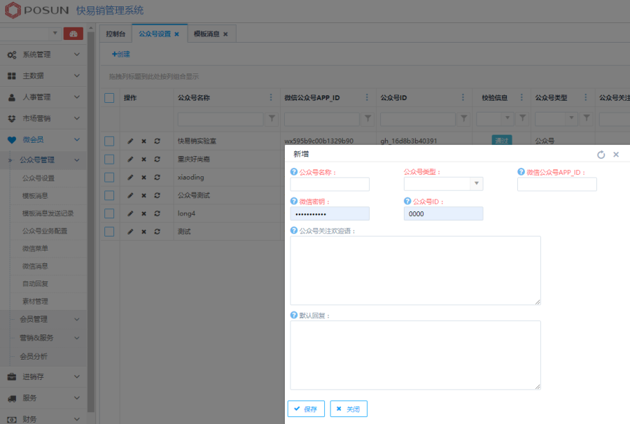 点击页面左上方的<创建>按钮,进入到新增页面,输入公众号名称、微信ID、微信秘钥、微信号、欢迎词(可不输入)点击保存按钮。