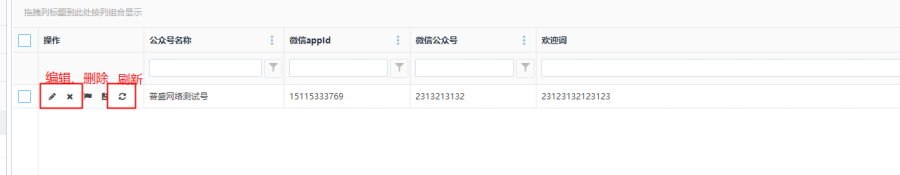 点击<编辑>按钮,可以对公众号进行编辑操作;点击<删除>按钮,可以对公众号进行删除操作;点击<刷新>按钮,可以对公众号进行刷新操作。