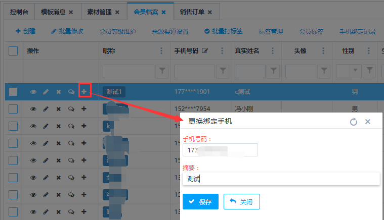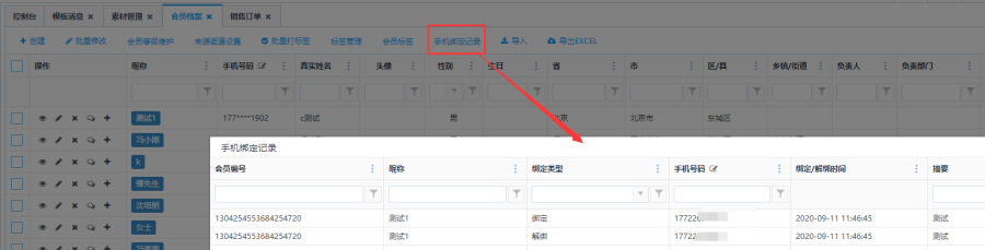 点击操作栏中的<更换绑定手机>按钮,弹出更换绑定手机界面,输入更换的手机号,点击保存按钮,更换绑定手机成功。